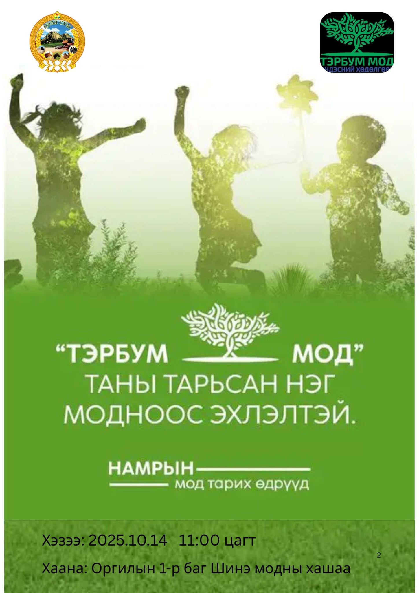 Нэг хүн нэг мод "Тэрбум мод" Таны тарих нэг модноос эхэлнэ. Хог биш мод тарьцгаая. 2025.10.14-нд нэг өдрийг агаарт гарангаа мод тарихийг УРИАЛЖ байна. Идэвхтэй оролцож, гэр бүл найз нөхдөөрөө хүрэлцэн ирэхийг урьж байна