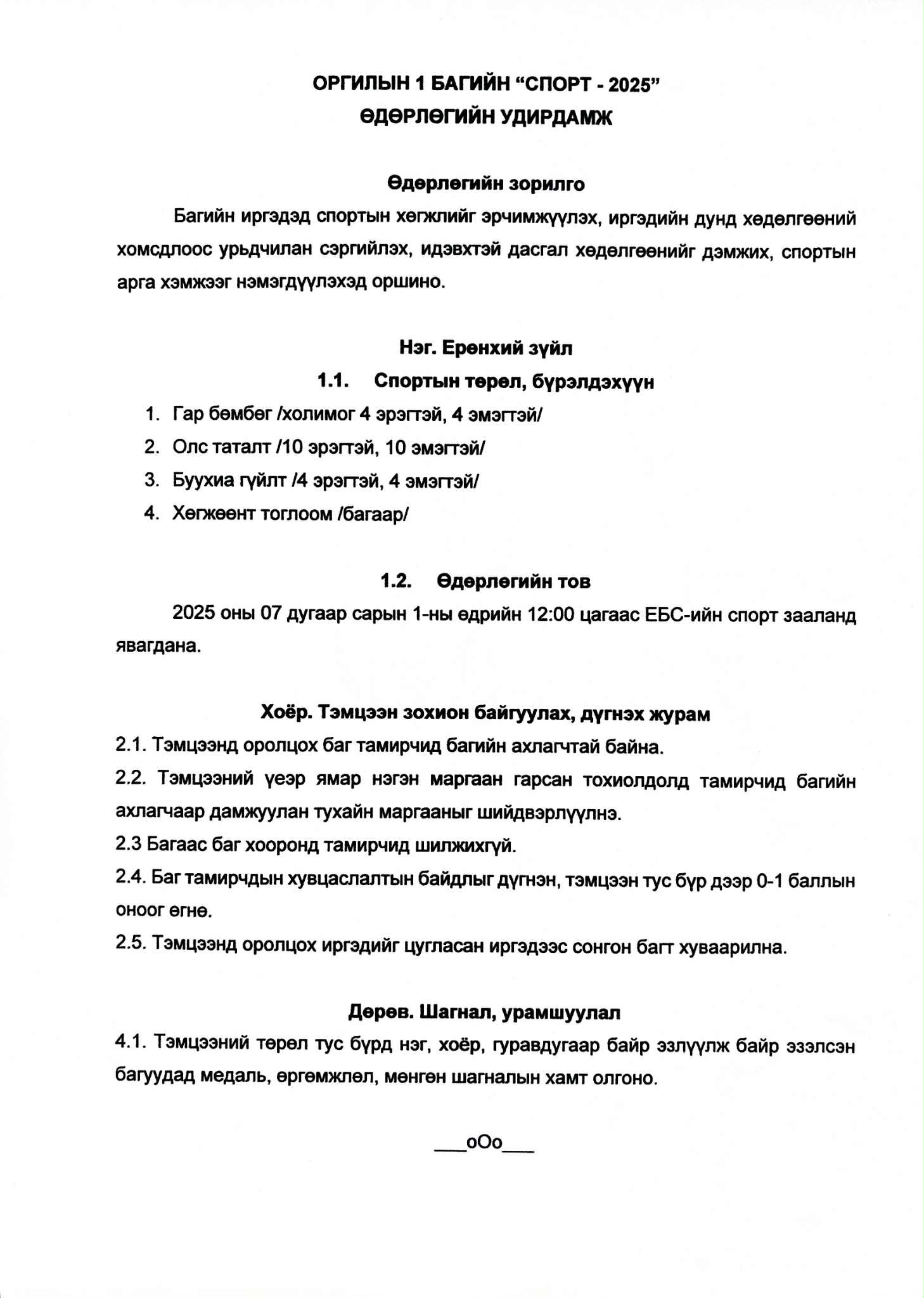 Оргилын 1-р багийн өдөрлөг 2025 оны 07-р сарын 01-ны 10 цагт ЕБС-ын спорт зааланд болох тул багийн иргэд та бүхнийг өдөрлөгтөө идэвхитэй оролцохыг урьж байна.
